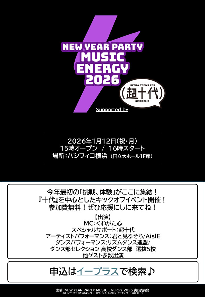 2026.01.08 『NEW YEAR PARTY MUSIC ENERGY 2026 Supported by 超十代』出演決定!! 1/12(月・祝)にパシフィコ横浜 国立大ホールにて開催される『NEW YEAR PARTY MUSIC ENERGY 2026 Supported by 超十代』にAislEの出演が決定しました!!日程:2026.1.12(月・祝)開場:15:00 開演:16:00会場:パシフィコ横浜 国立大ホール(神奈川県横浜市西区みなとみらい1-1-1)参加申込:https://eplus.jp/sf/detail/4451980001
